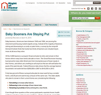 | Learn more about this senior living trend and how in-home care helps boomers support their living choices in the Right at Home blog, where you will always find the latest information about senior care and home care. |